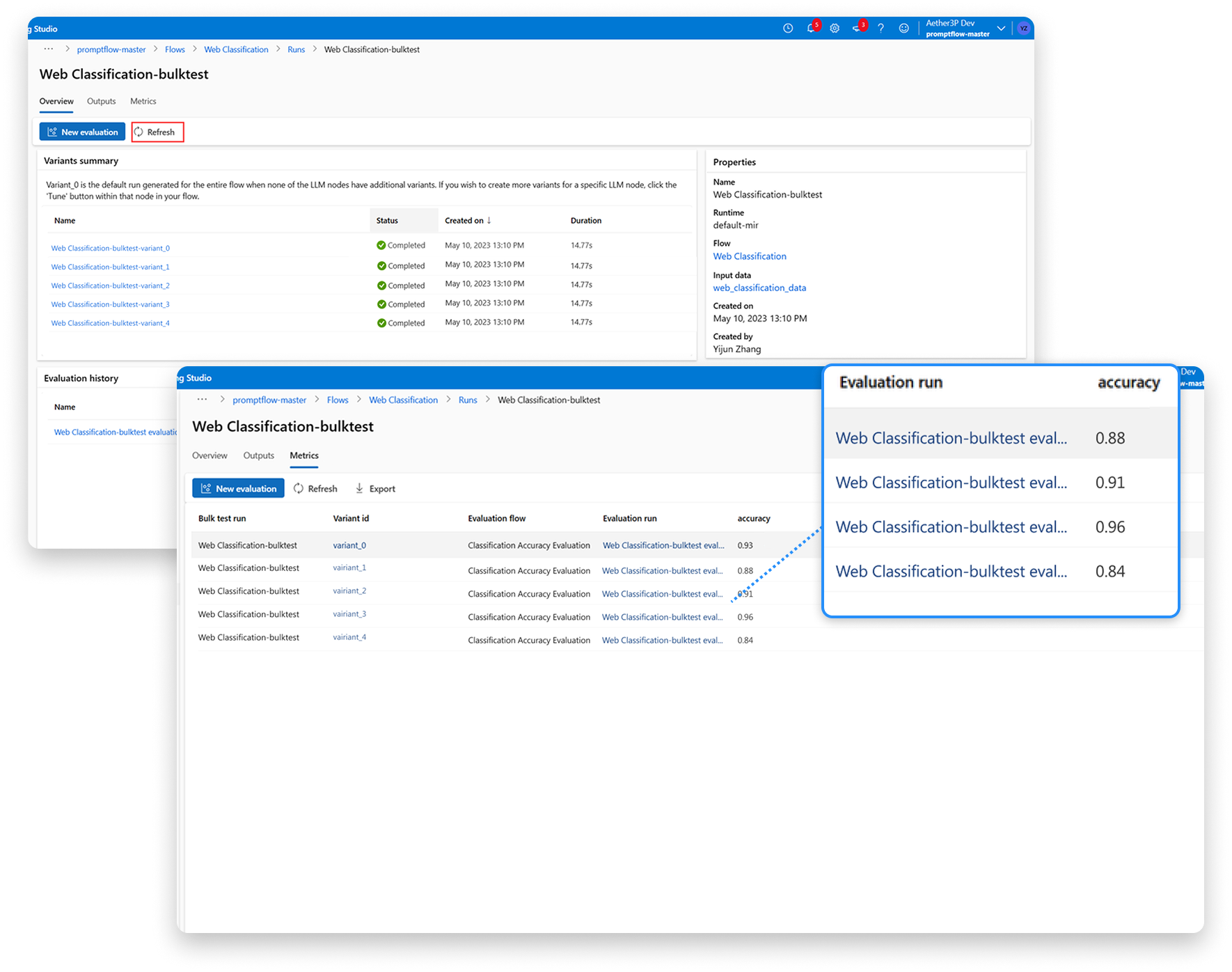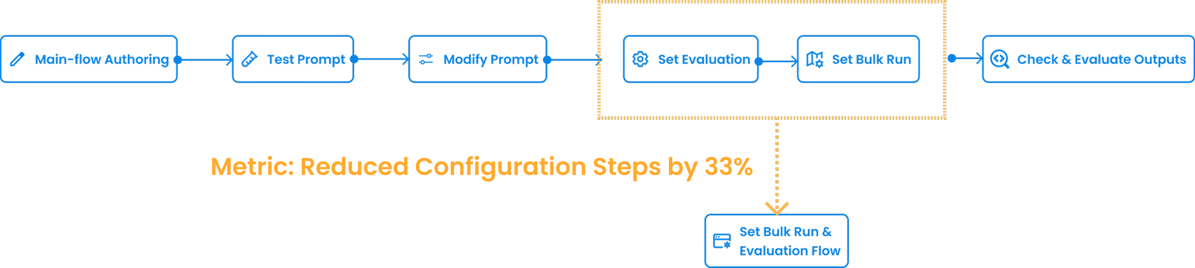 A centralized evaluation flow that enables bulk testing, standardized metrics, and side-by-side comparison.