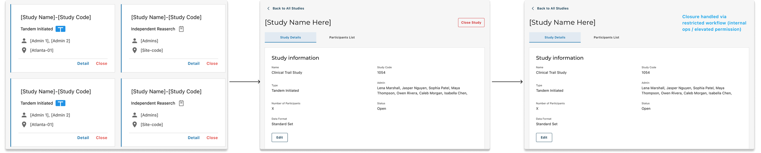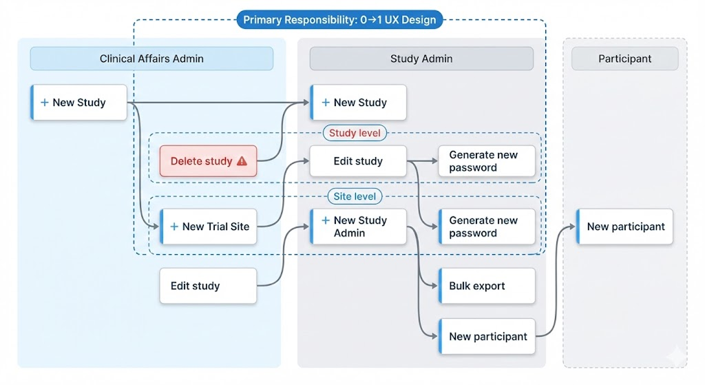 Built a Study → Site → Participant hierarchy to reduce navigation thrash—global actions at Study level, day-to-day ops at Site level.